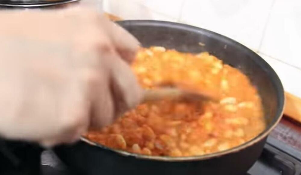 U drugoj posudi, upržite 1-2 sitno seckane glavice luka dok ne omekša, dodajte mleveni paradajz i mlevenu papriku. Kada voda ispari, dodajte malo brašna rastvorenog u vodi, a nakon toga oceđeni skuvani pasulj. Pržite jelo dok se ne zgusne.