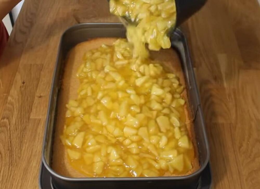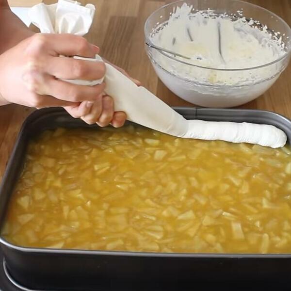 Pecite u zagrejanoj rerni na 180°C oko 20 minuta. U šerpu sipajte vodu (900 ml) i dodajte šećer, a kada proključa dodajte jabuke koje ste sitno iseckali. Ostatak vode (100 ml) pomešajte sa pudingom i dodajte u jabuke. Kada jabuke budu gotove vruć fil sipajte preko kore. Ostavite da se ohladi na sobnoj temepraturi, a zatim stavite u frižider. Umutite slatku pavlaku i dekorišite kolač.