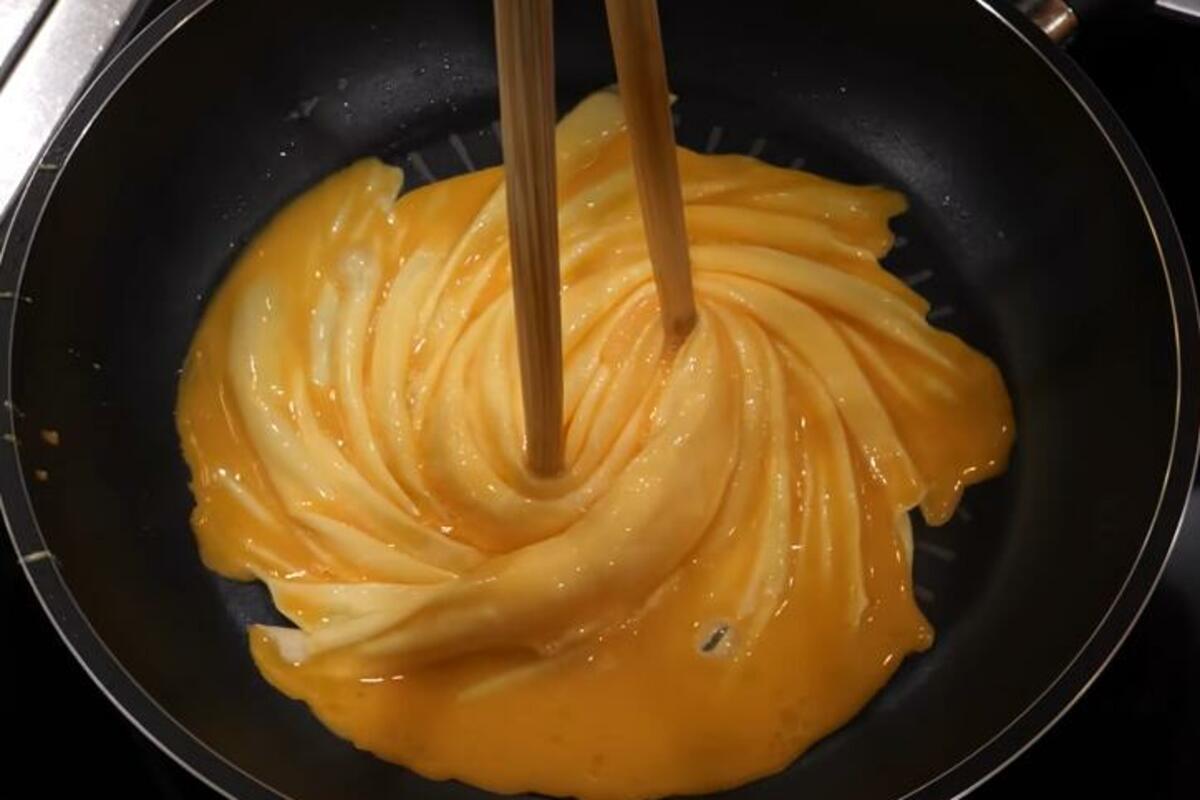 Počinje se kao sa standardnom kajganom, dakle sa razmućenim jajima u vrelom ulju. Onda uhvatite sredinu štapićima i polako vrtite ispečeni deo. Vrtite sve dok jaja u potpunosti nisu termički obrađena, kao što je pokazano na snimku: