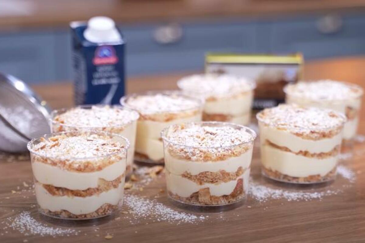 Lisnato testo izmrvite, a zatim ga sipajte u čašu i preko stavite fil, pa ponovo testo i tako sve dok ne popunite čašu. Neka poslednji red bude testo. Pospite šećerom u prahu i mutite.