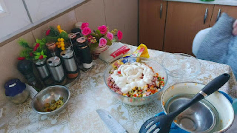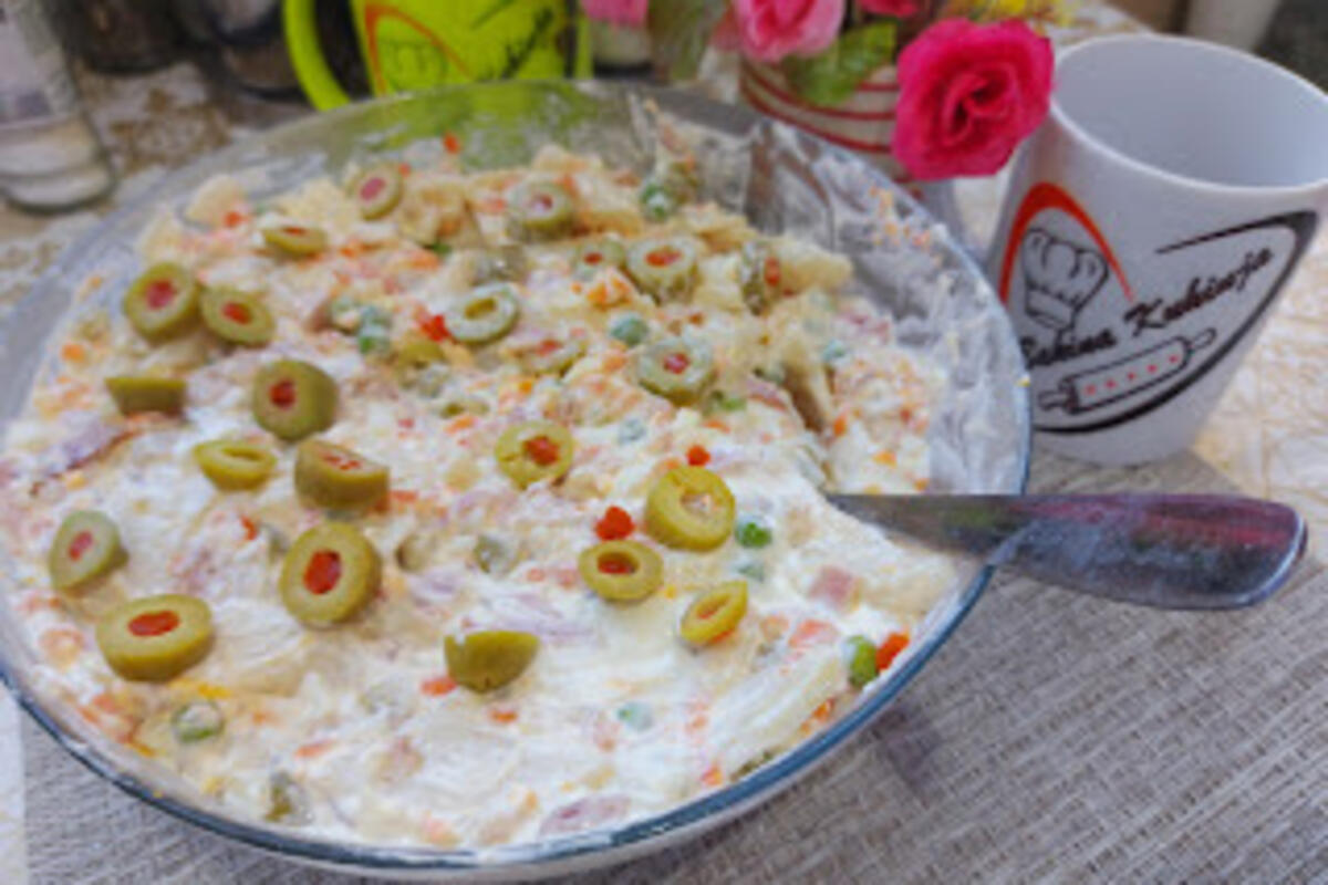 Povrće skuvati pa i njega ohladiti. U testeninu dodati ohladjeno povrće, jaja, majonez, kiselu pavlaku seckanu šunku seckane maslinke i posoliti. Sve dobro izjednačiti.