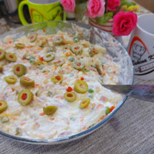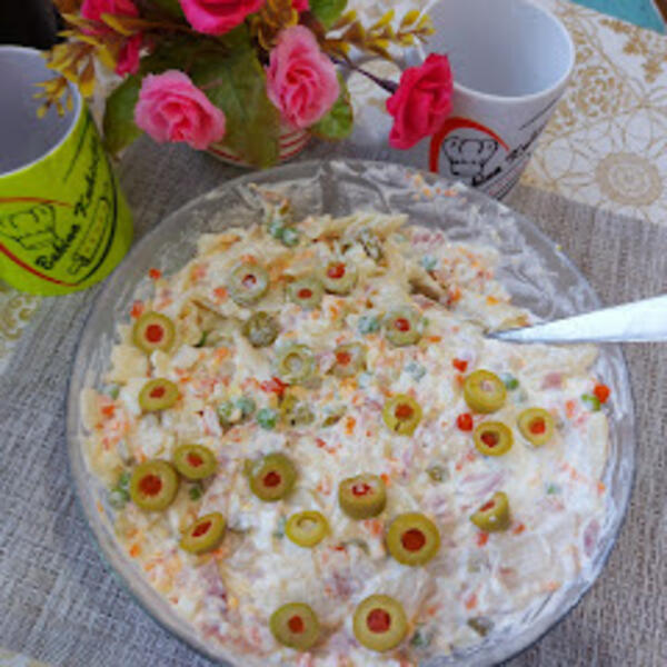 Povrće skuvati pa i njega ohladiti. U testeninu dodati ohladjeno povrće, jaja, majonez, kiselu pavlaku seckanu šunku seckane maslinke i posoliti. Sve dobro izjednačiti