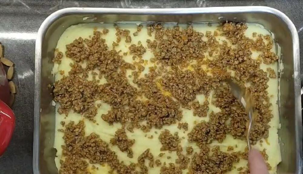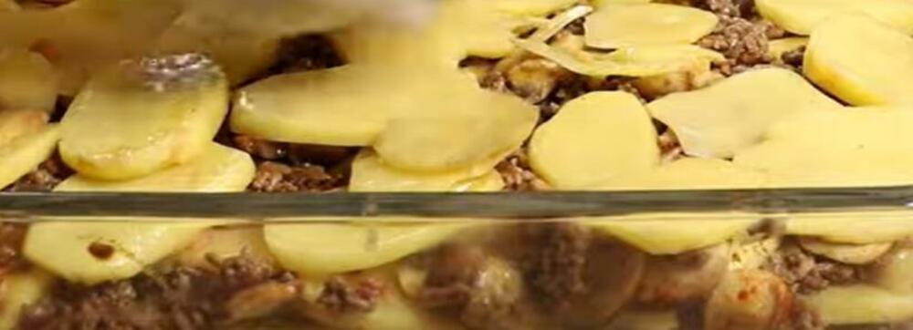 Polovinu krompira poređati, a neprženo mleveno meso staviti preko, pa dodati ispržen luk sa začinima preko toga i staviti drugi red kolutova krompira. Prekriti folijom i peći u rerni na 220 stepeni C do 30 minuta. Izvaditi iz rerne, i preliti sa umućenim jajima u koja ste dodali pola rendanog kačkavalja, mleko i kiselu pavlaku.
