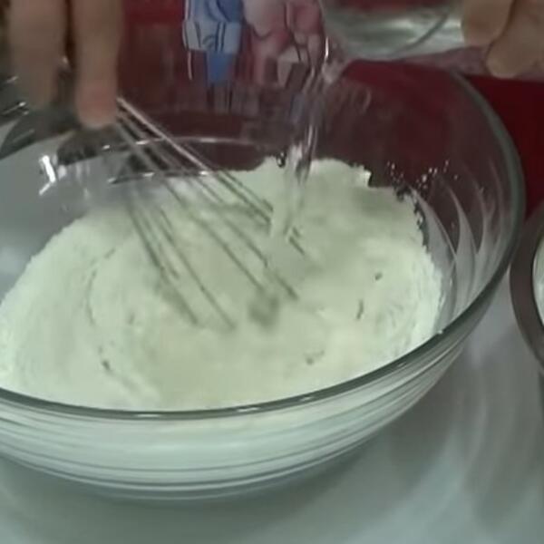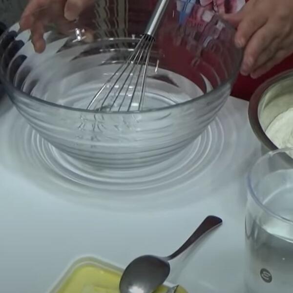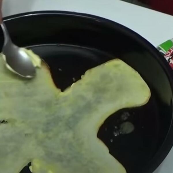 Umutite jaja, pa dodajte brašno i vodu. Sjedinite mikserom, testo treba da bude kao za palačinke. Rernu dobro zagrejte na 250°C, a rešetku podignite na najvišu poziciju. Uzmite tepsiju, nauljite je, pa sipajte smesu kutlačom. Kružnim pokretim pomerajte tepsiju, da se smesa lepo razlije po dnu (treba da bude tanak sloj).