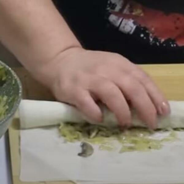 Iseckati praziluk na sitne komade i malo ga propržiti u tiganju, a zatim dodati usitnjene šampinjone. Nastaviti sa prženjem sve dok višak vode iz pečuraka ne ispari.