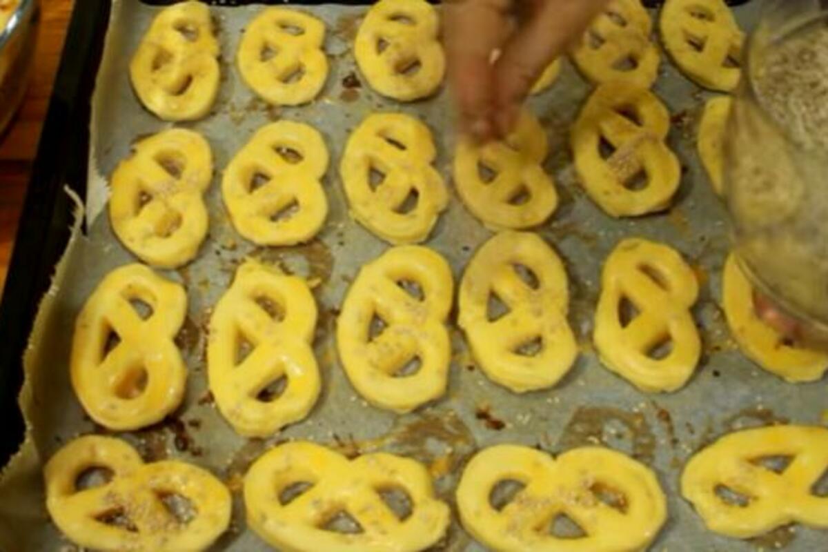 Zamesiti testo i ostaviti da odmori 15 minuta. Izdvojiti nekoliko loptica pa svaku lopticu razviti u tanak valjak i oblikovati perece po izboru.
