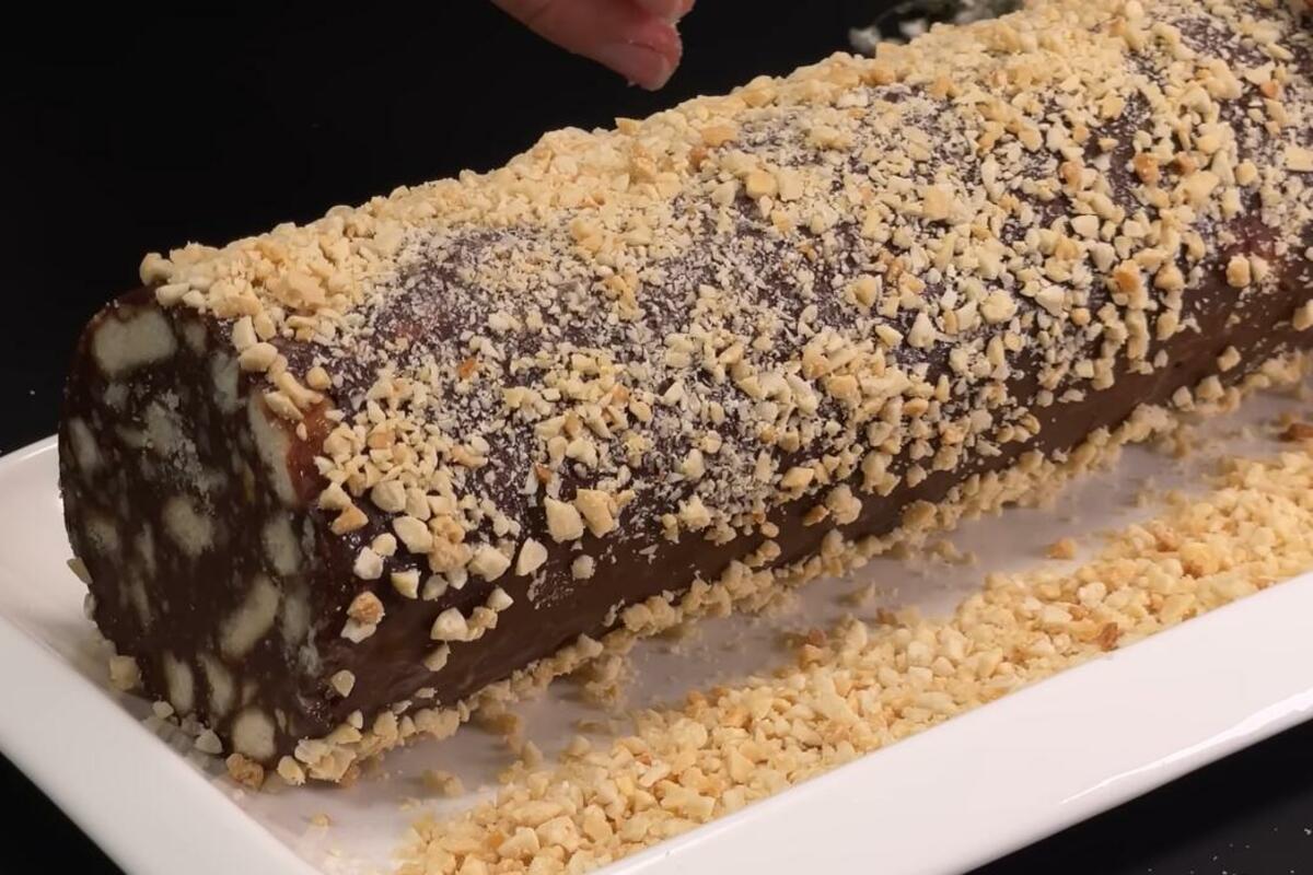 Sklonite sa šporeta i sipajte smesu u posudu gde su keks i kikiriki. Promešajte i sipajte smesu na pek papir. Urolajte i umotajte u pek papir, pa ohladite. Premažite istopljenim medom i uvaljajte u mleveni kikiriki (100 g).