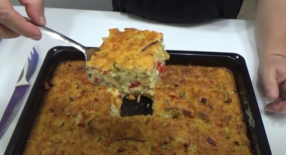 1. Umutit jaja mikserom, u umucena jaja dodati kiselo mleko ili jogurt, brasno, prasak za pecivo, malo soli, ako sir nije slan, i u masu staviti ostale sastojke sitno iseckane, iseckane krastavcice i papriku predhodno ocediti. Sve dobro izmesati, sipati u pleh i peci na 200 stepeni dok blago ne porumeni.