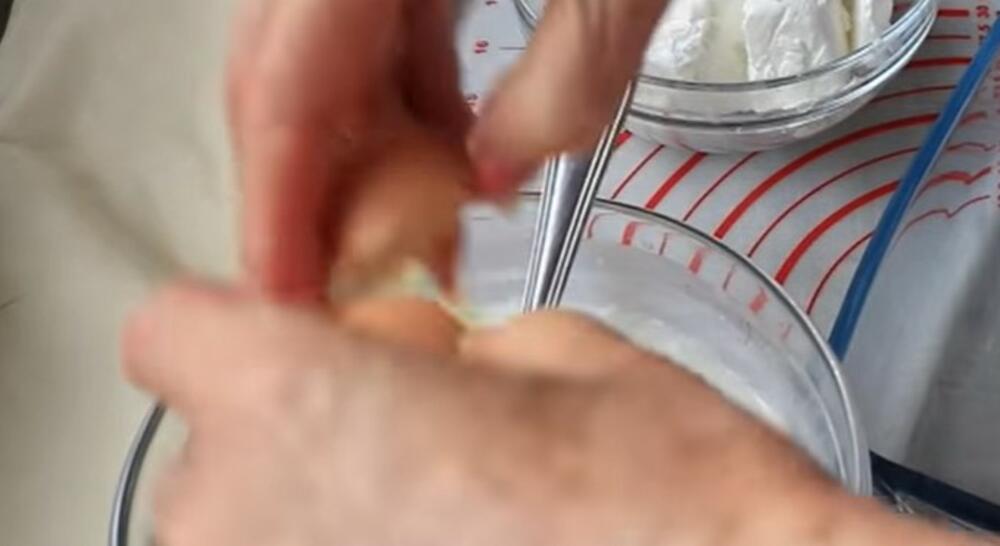 Umutiti jaja i ulje. Dodati kiselu vodu, pecivo i sir.