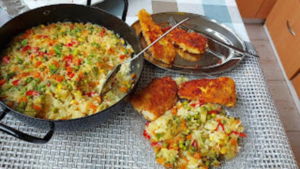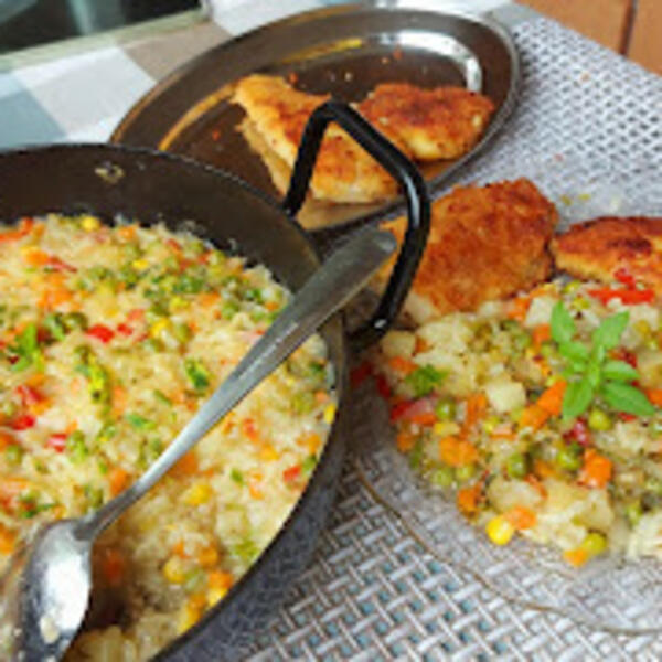 Na ulju propržiti seckan luk, dodati šargarepu, grašak i papriku. Kad se izdinsta dodati seckan krompir i opran pirinač. Naliti vodom, dodati začin so biber. i Kuvati 30 minuta da voda ispari. Jelo se ne meša.