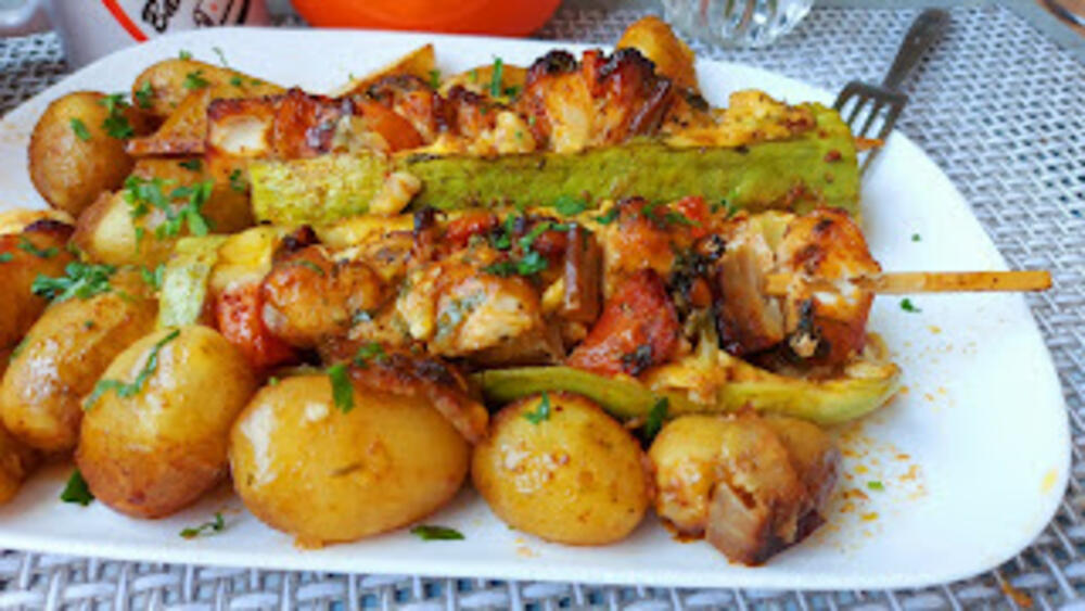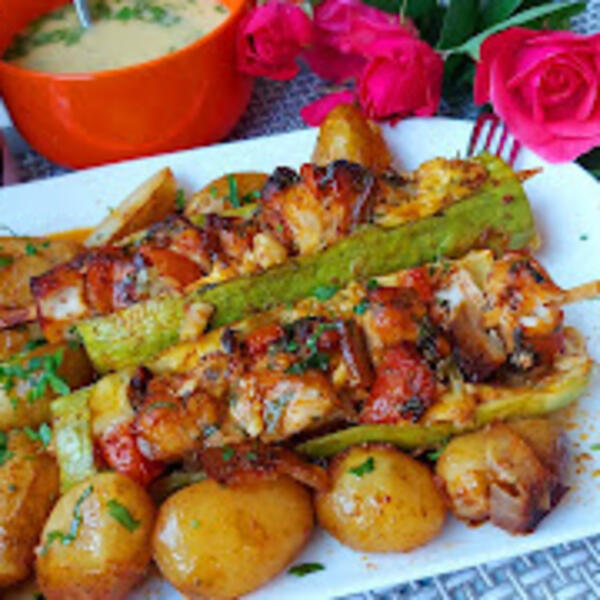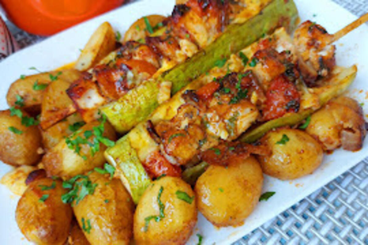 Možete u ostatak marinade uvaljati mladog krompirića pa staviti oko ražnjića i tikvica. Peći na 200 stepeni C 50 minuta. Služiti toplo. Fantastičan ukus. Prijatno!
