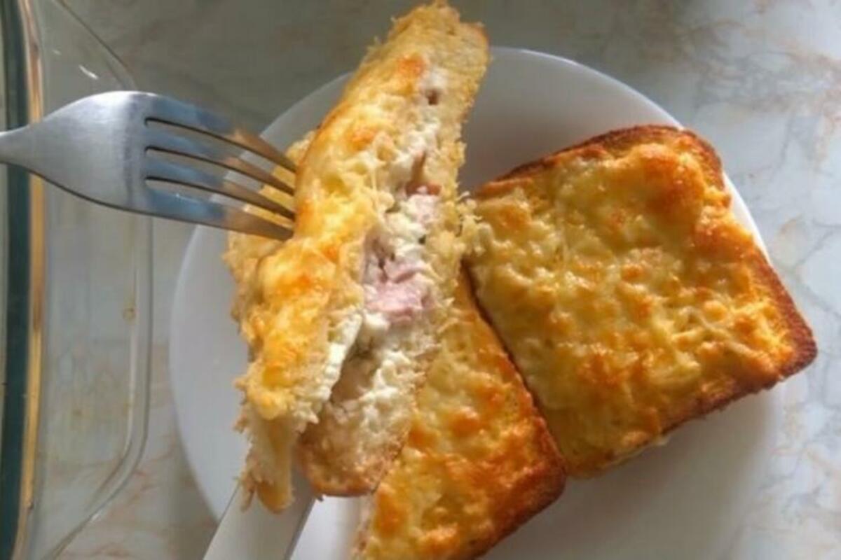 Sipati u dublju posudu jaja, mleko, ulje, so i biber, pa sve lepo umutiti. U drugu posudu izmrviti fetu, pa dodati šunku, malo kačkavalja i origano pa lepo sjediniti. Podmazati vatrostalnu posudu uljem. Kriške hleba umakati u jaja i ređati u vatrostalnu, pa odozgo na hleb staviti smesu sa sirom i šunkom. Poklopiti kriškama hleba takođe prethodno umočenim u jaja. Posuti kačkavaljem, pa staviti da se peče na 200 stepeni oko 20 minuta.