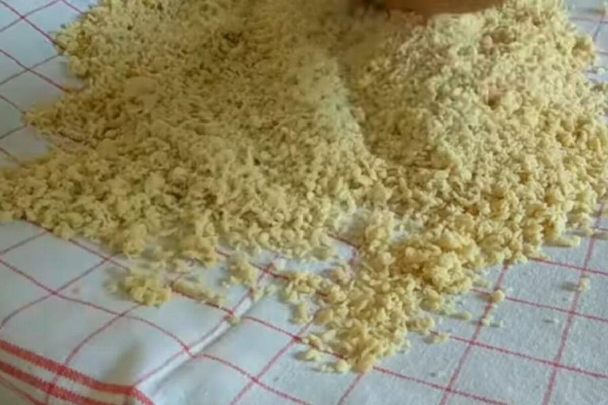 Kako god, u činiju stavite polovinu brašna i u njega umešajte jaja. Dodajte postepeno i ostatak brašna. Testo nije potrebno dugo mesiti, dovoljno je da sve sjedinite. Bitno je da testo bude suvo i tvrdo kako biste ga mogli narendati na trenicu. Za rendanje uzimajte manje komade testa, lakše je. Samo vodite računa da ne narendate i prste zajedno sa testom. Testo rendajte na krupnije rende za krupnije komadiće, a na sitno za male mrvice testa koje će izgledom najviše podsećati na kus-kus.