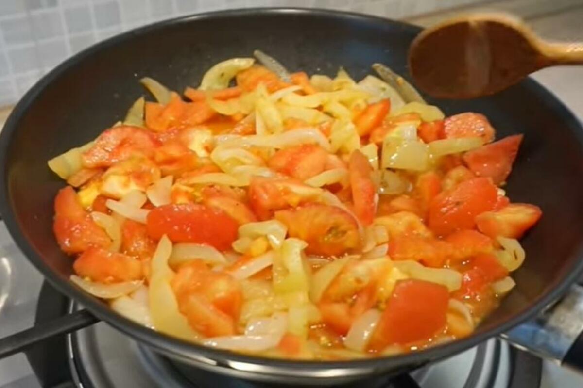 U tiganj sipajte ulje iseckajte crni luk kako bi se prodinstao. Dodajte papriku isečenu na trakice i nju dinstajte zajedno sa lukom dok ne omekša. Na drugoj strani, stavite paradajz u kipuću vodu na 1-2 minuta, zatim ga prohladite i oljuštite. Isecite ga na kriške i dodajte u tiganj s paprikom i lukom. Neka se dinsta na srednjoj vatri uz povremeno mešanje 10-20 minuta. Dodajte beli luk na kraju i začine, posolite i pobiberite i ne zaboravite origano. Dinstajte i mešajte neko vreme kako bi tečnost isparila. Umutite jaja viljuškom, a onda ih dodajte u sataraš i promešajte. Sklonite nakon 2-3 minuta sa ringle i ostavite da se hladi.