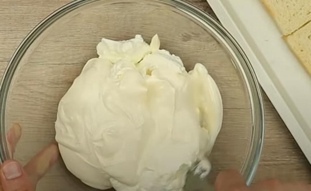 U činiju stavimo kram sir, majonez i pavlaku. Mešamo dok se sve lepo je sjedini. Podelimo na tri dela.
