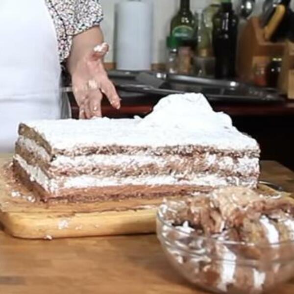 1. Umutite belanca sa šecerom, dodajte brašno, lesnike, rendanu čokoladu i seckane orahe. Sjediniti pa speci koru na 180 stepeni. Koru preseci na pola po duzini. (koristiti pleh od sporeta)
