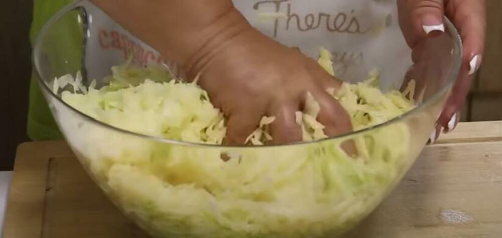 Priprema: Tikvice izrendajte i poslolite. Izrendajte i krompir. Jaja umutite žicom, pa im dodajte čašu jogurta, čašu kisele vode i čašu ulja. Dodajte kukuruzno brašno, začine, sir, pa rendan krompir i tikvice.