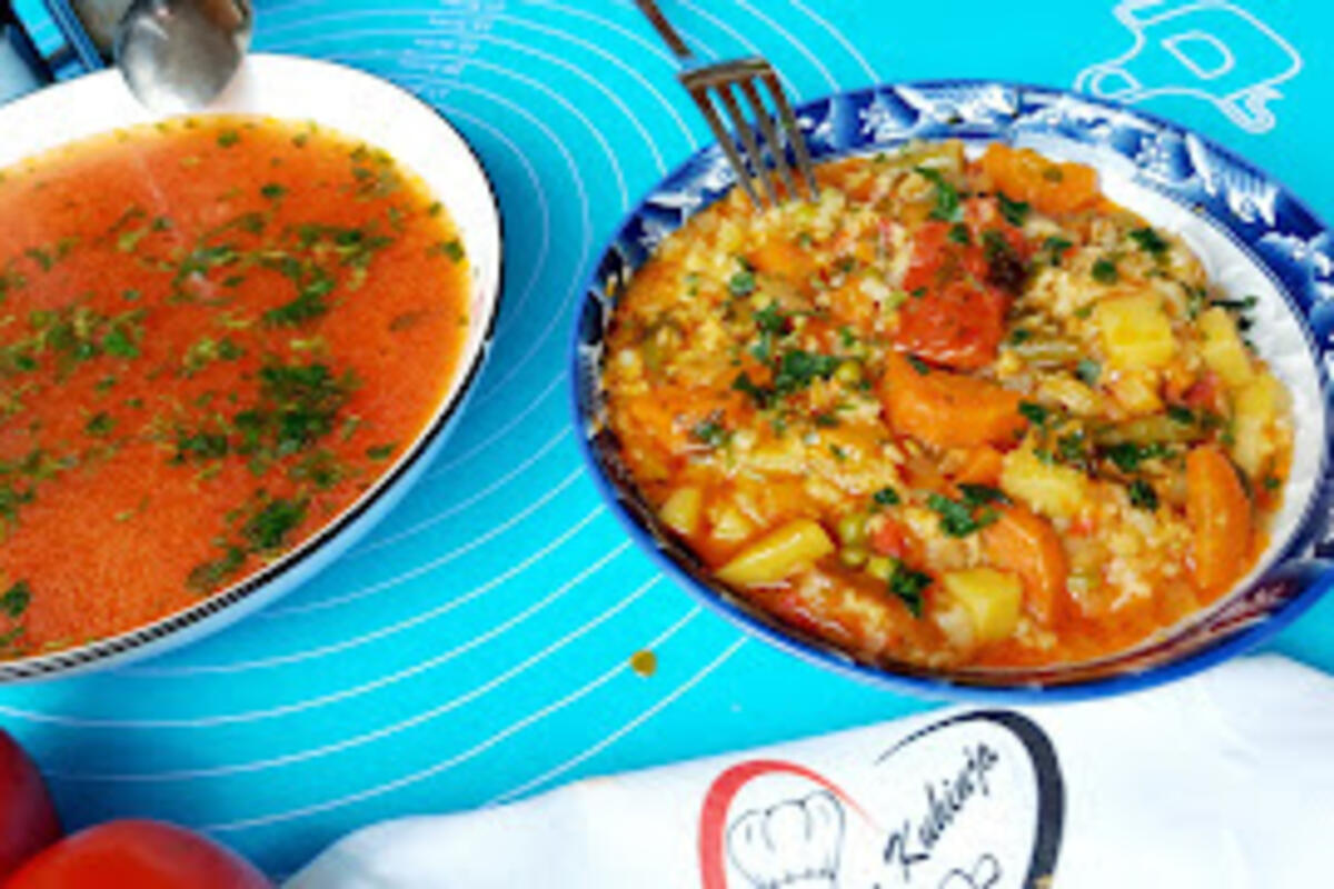 Na ulju propržiti seckan luk, šargarepu, da dodati smrznuti sastav za djuveč ili 2 sveže paprike sečene, 2 šake graška, malo boranije pa sve lepo propržiti.
