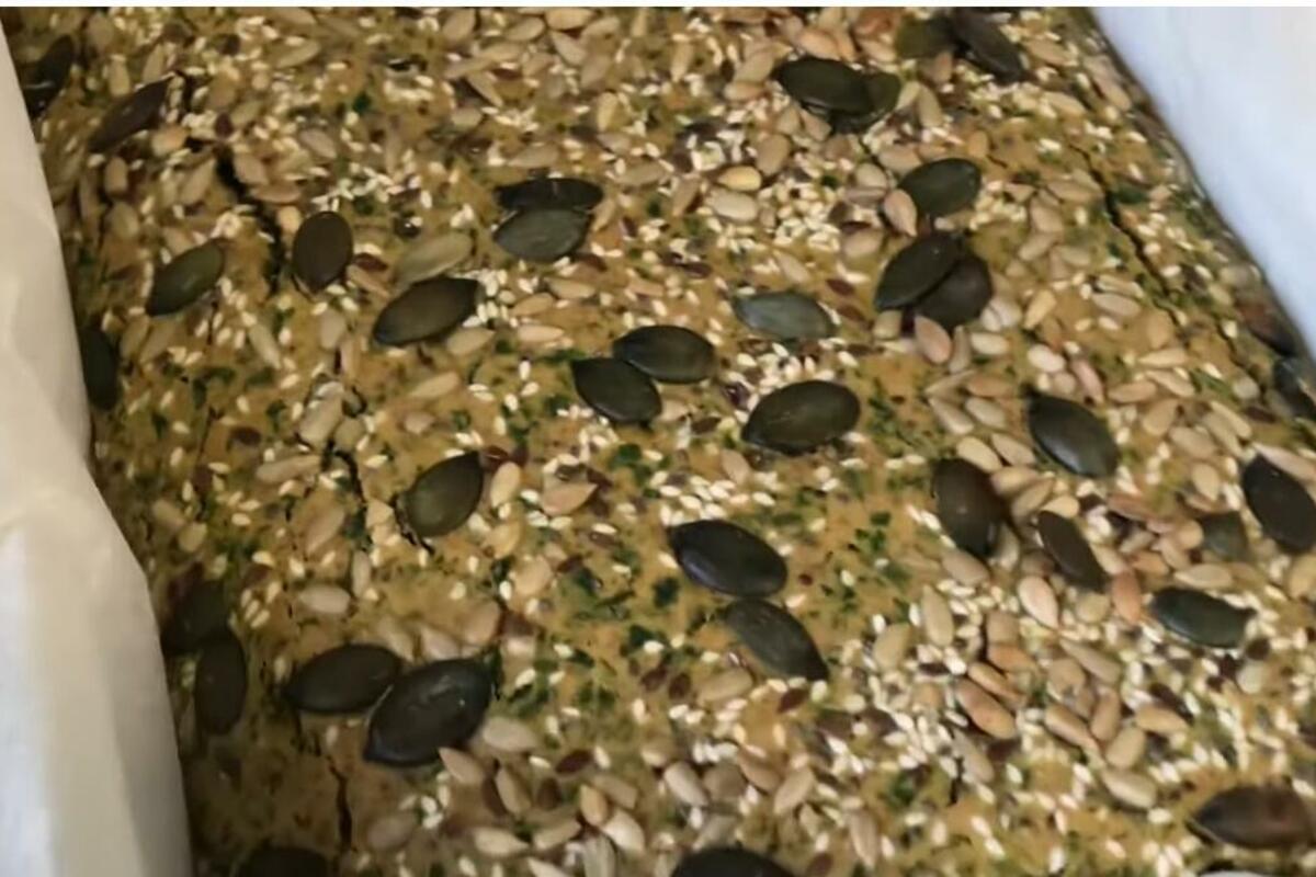 - Podmažite okruglu posudu prečnika 25-30cm pospite polovinu semenki, stavite pripremljenu smesu i odozgo rasporedite ostatak semenki.