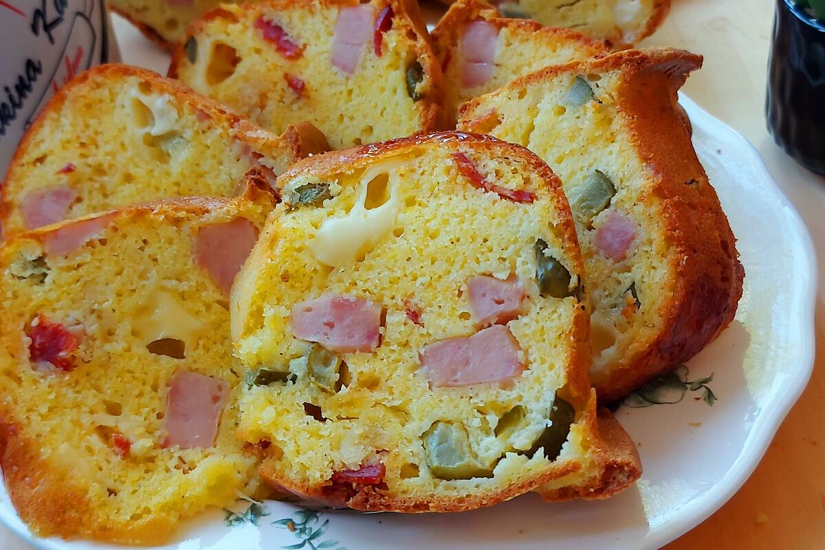 - Umutiti jaja dodati malo soli bibera brašno sa praškom za pecivo, šunku na kockice, kačkavalj na kockice,krastavčići na kockice , ulje, jogurt i sve dobro izmešati,