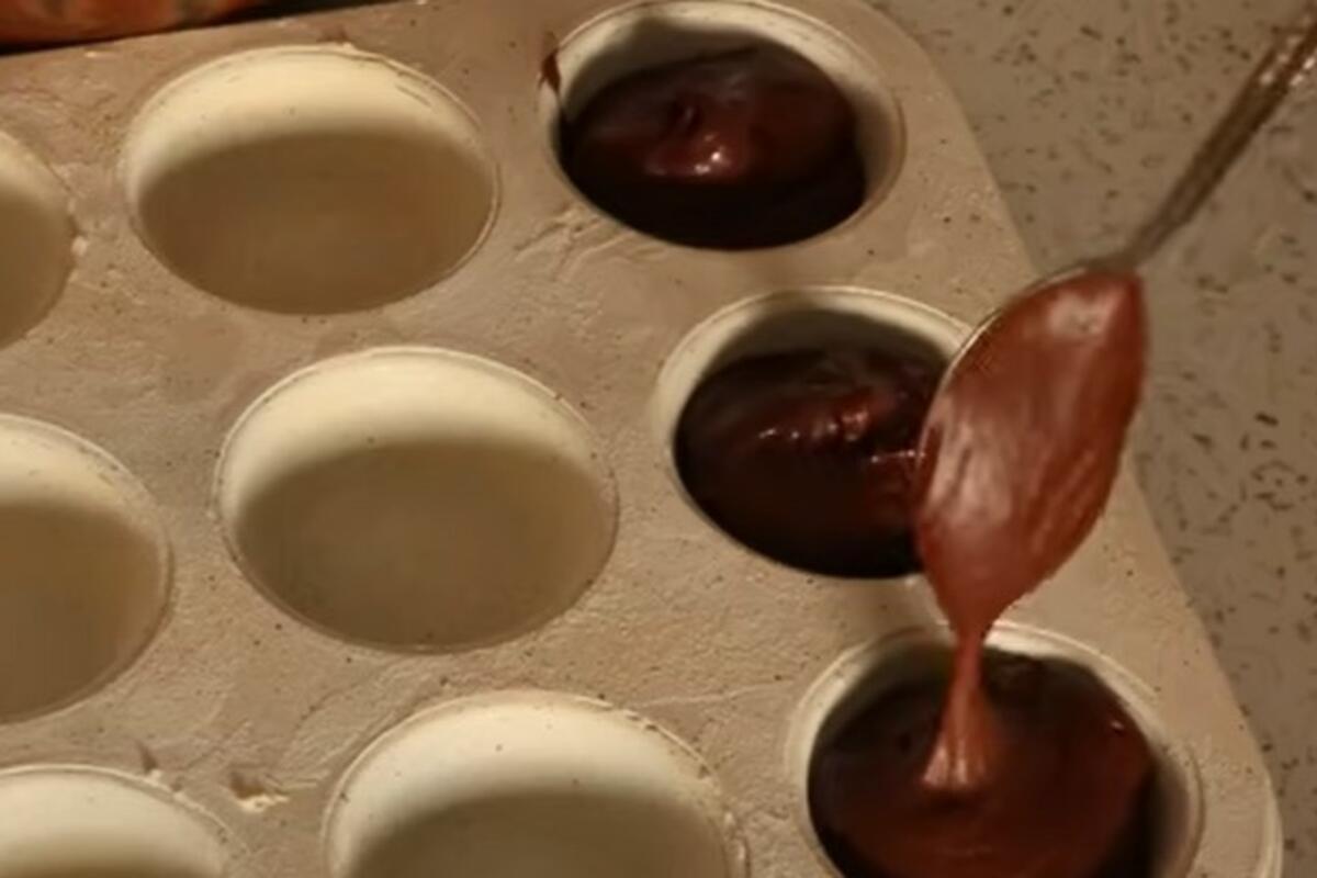 U okruglie kalup za projice stavite malo smese, do pola kalupa. Zatim stavite 1-2 čokoladna komadića u svaki kalup. Prekrijte čokoladu preostalom smesom tako da kalupi budu napunjeni do 2/3 visine.