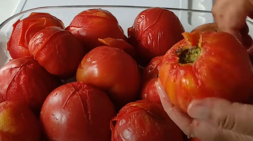 U većoj posudi staviti vodu da prokuva. Kada proključa ubaciti paradajz. Kuvati ga dotle dok ne počne kožica da se odvaja od paradajza na krstiću. Izvaditi ga na tacnu da se prohladi, pa ga oljuštiti.