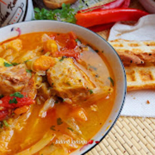 U šerpu iseci pola glavice kupusa na kocke i staviti na dno. U sredinu poređati meso, šargarepu, kockice krompira, celer, papriku svežu . Sve to pokriti sa drugom polovinom kupusa.