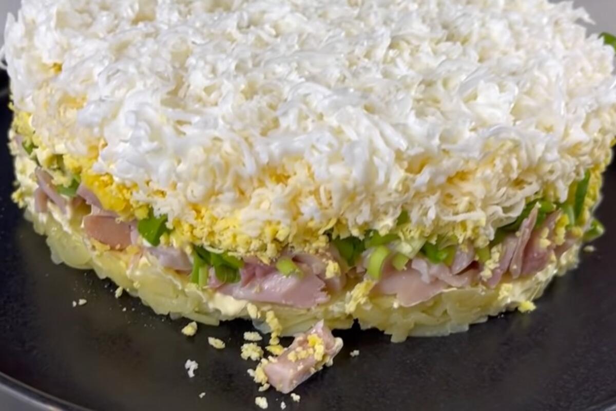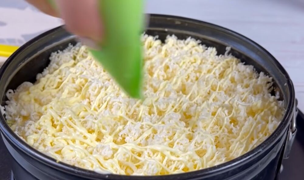 - Na sitno rende narendajte drugu polovinu sira. Po dnu okruglog kalupa rasporedite krompir, posolite, pa premažite pavlakom. Preko poređajte šunku i premažite majonezom.
