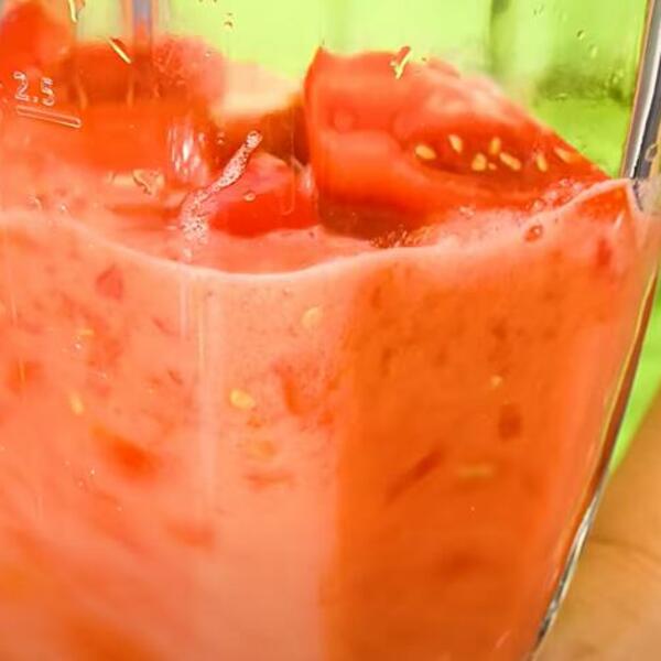 Papriku ispecite, oljuštite i naseckajte na komade. Paradajz sameljite i kuvajte dok se ne zgusne. Beli luk oljuštite i naseckajte na sitno.