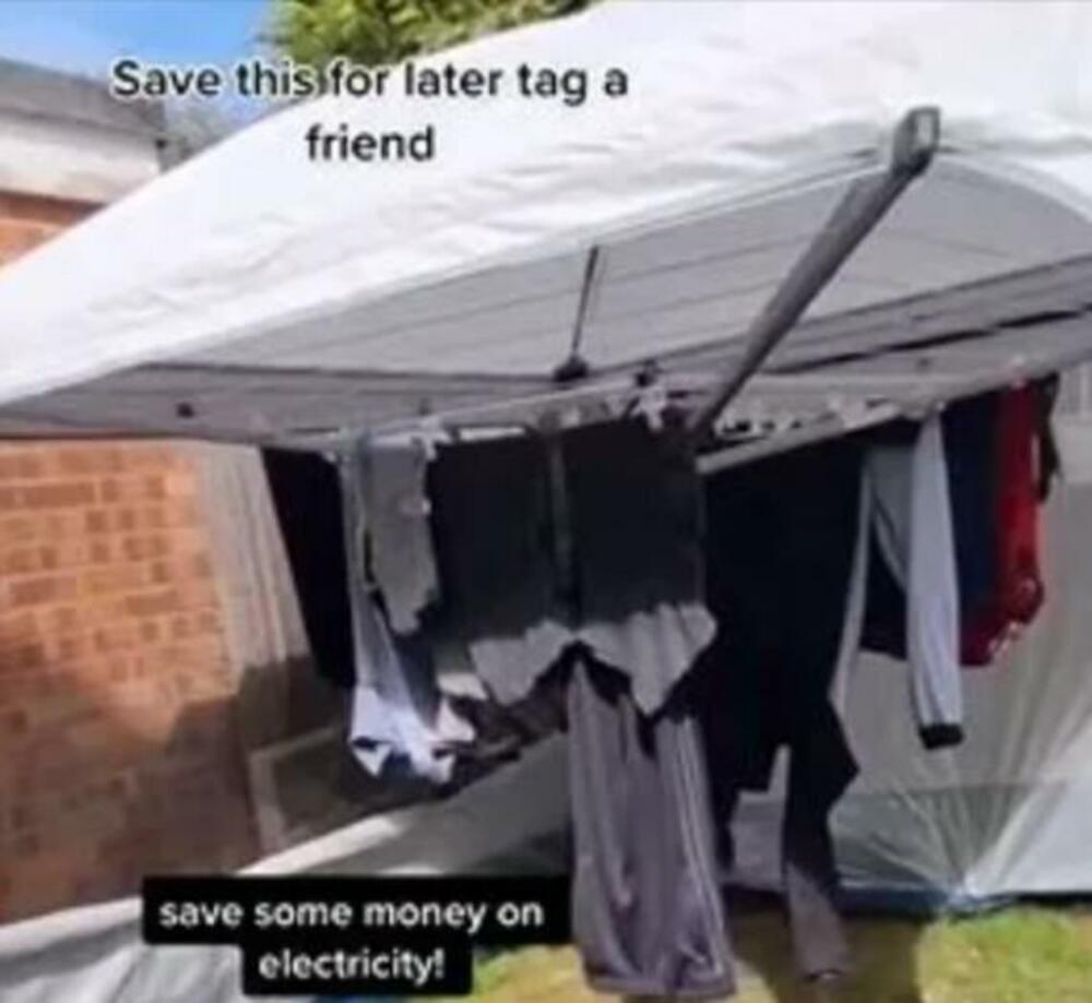 Naime, ona je rešila da suncobran-tendu koju koristi tokom toplih letnjih dana za zaštitu od sunca sada iskoristi na drugi način. Ona je ovu imrpovizovanu tendu namontirala preko sušila za veš. Budući da postoji četiri dela koja svako šatorsko krilo vezuju za zemlju, ona je to uspela da veže za delove sušila za veš. Tako je usred dvorišta dobila idealnu sušilicu za veš koja čak ima i nastrešnicu u slučaju kiše.