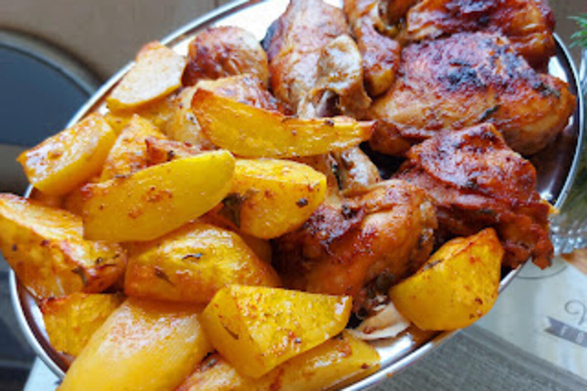 Usitnine beli luk pa ga promešajte u posudici sa malo maslinovog ulja. U piletinu prethodno izbockanu nožem dodajte iseckan crni luk, tucanu i slatku papriku, so, kari začin, kefir i rukama dobro sjedinite sve. U smesu sa mesom i začinima dodajte i isečen krompir, pa pokrijte prozirnom folijom da se začini upiju. Poređajte po plehu obloženom pek papirom batake i okolo njih krompir. Pospite ostatak sosa po batacima i krompirima. Pecite u prethodno zagrejanoj rerni na 220°C oko 35 minuta, pa pojačajte na 250°C i pecite još 10 minuta. Sveži peršun umočite u posudicu na belim lukom i maslinovim ulje, pa ukrasite njim pečeno meso.
