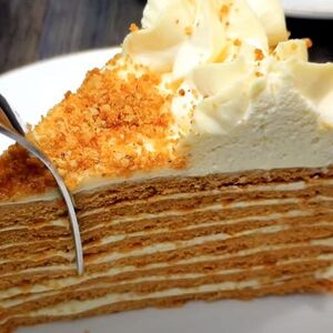 Dodajte oreo keks i ponovo promešajte. Smesu izlijte preko drugog sloja i ostavite da se ohladi 30 minuta. Okrenite naopako pleh i izvadite tortu tako da prvi sloj bude poslednji. Premažite je medom, pa pospite izblendiranim oreo keksićima.