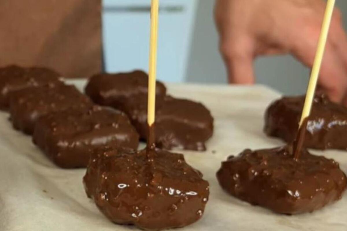 Dodajte med i sve dobro sjedinite. Oblikujte kocke i ređajte na tacnu ili pek papir, pa stavite u frižider na 2 sata. Istopite čokoladu sa uljem, pa dodajte mlevene orahe i dobro sjedinite. Ubacite čokoladne kolače u glazuru, pa ređajte na tacnu i vratite u frižider da se stegnu.