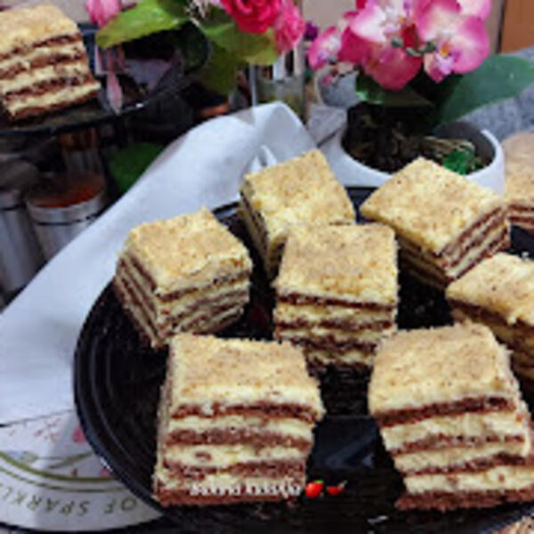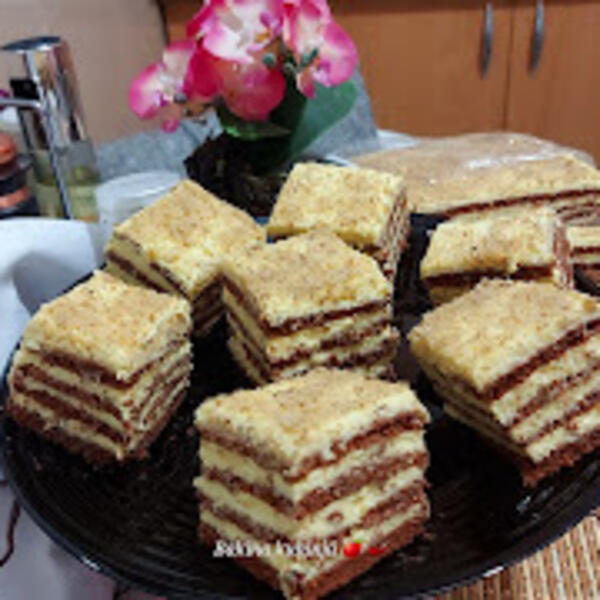 Izvrnutu dugačak posluzavnik naopako pa staviti prvu koricu i premazati četvrtinom krema, staviti drugu, trecu, pa četvrtu koricu i sve ih premazati odozgo pa posuti ml. orasima. Moze i glazura od cokolade. Ostaviti u fruzideru 3 sata ili preko noći. Vrhunska i tako kremasta.
