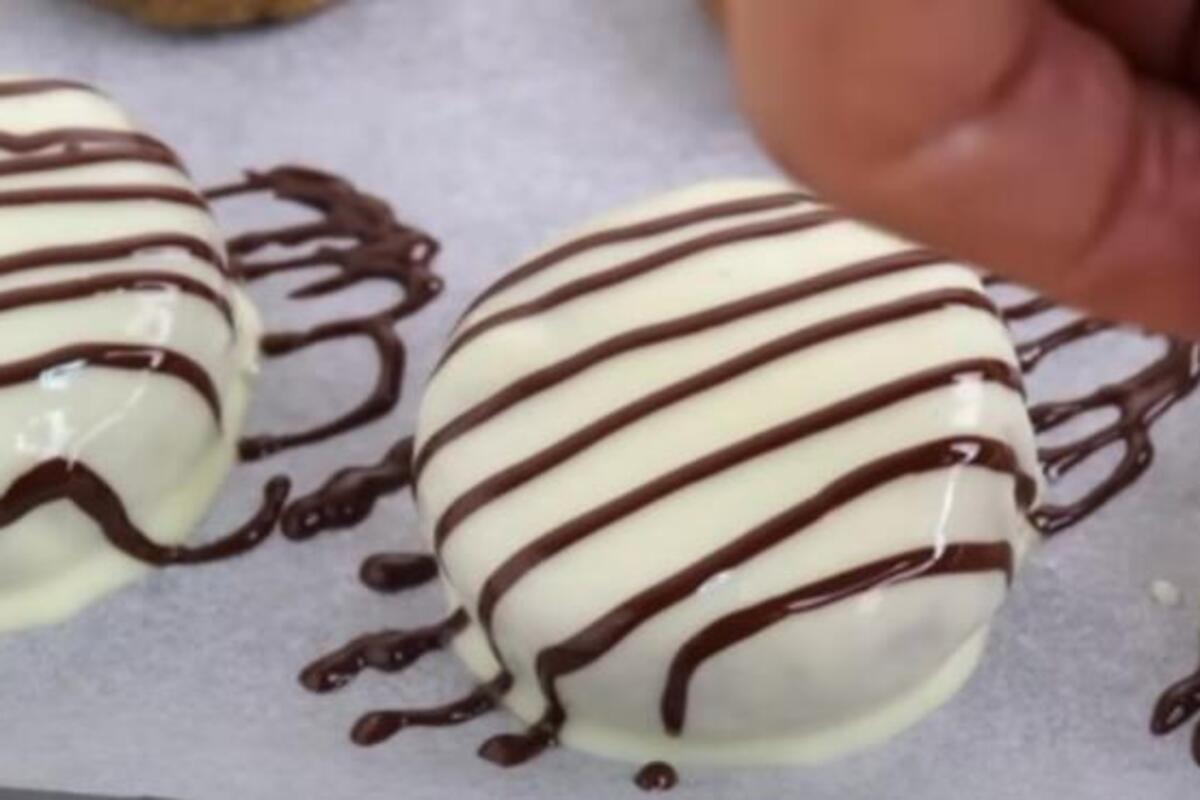 Uvaljajte sitne kolače u istopljenu belu čokoladu, a ukrasite istopljenom crnom čokoladom.