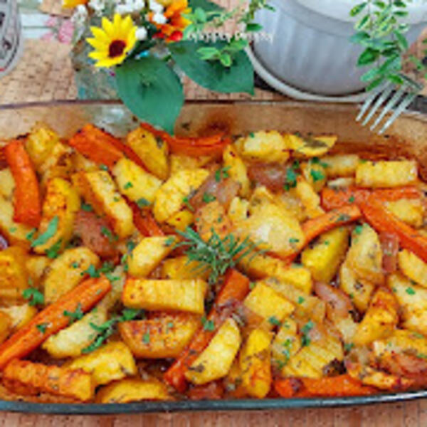 Tako začinjen krompir sipati u podmazan pleh i peći na 220 stepeni C da lepo porumeni.