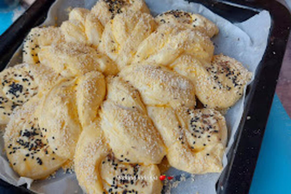 Nožem iseći na trake ali ne do kraja. Svaku rolnicu okretati na levu i na desnu stranu. Premazati žumancetom u koji smo staviti 1 kašiku mleka. Posuti susamom. Peći na 200 stepeni 40 minuta da porumeni. Prijatno!