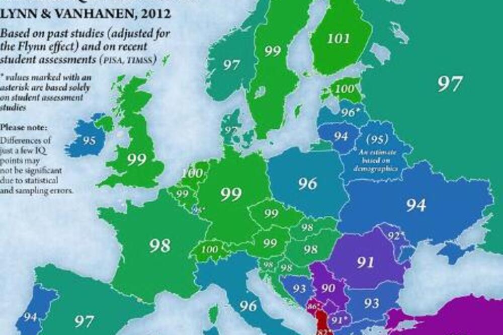 Objavljena je karta Evrope na kojoj su prosečne vrednosti koeficijenta inteligencije za sve evropske narode