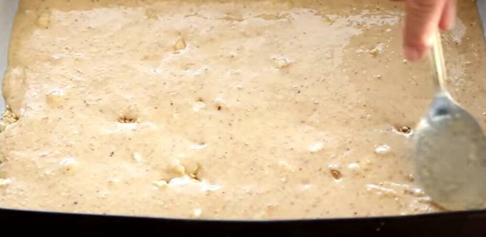 Stranice pleha, vel. 35x25 cm, premazati uljem, a dno obložiti pek papirom. Preko papira, ravnomerno, rasporediti 50 g krupnije iseckanog lešnika. Umućeno testo sipati preko lešnika i kašikom poravnati. Staviti da se peče, oko 15 minuta.