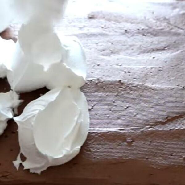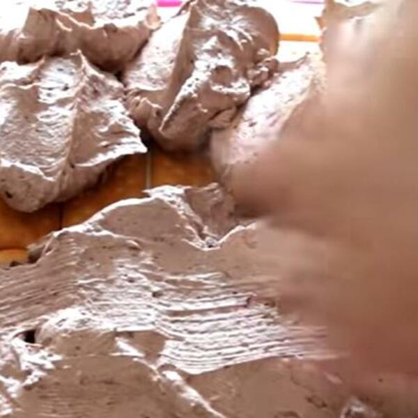 Pečenu koricu izvaditi i ostaviti da se ohladi. Ohlađenu koricu prevrnuti na radni sto i skloniti pek papir. Na isti način umutiti i ispeći još jednu koricu.