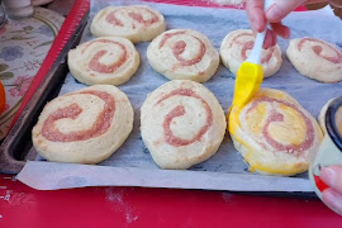 Uviti u rolat i iseći manje rolatiće širine 2 prsta. ReĐati u podmazan pleh premazati žumamancetom i posuti kačkavaljom.