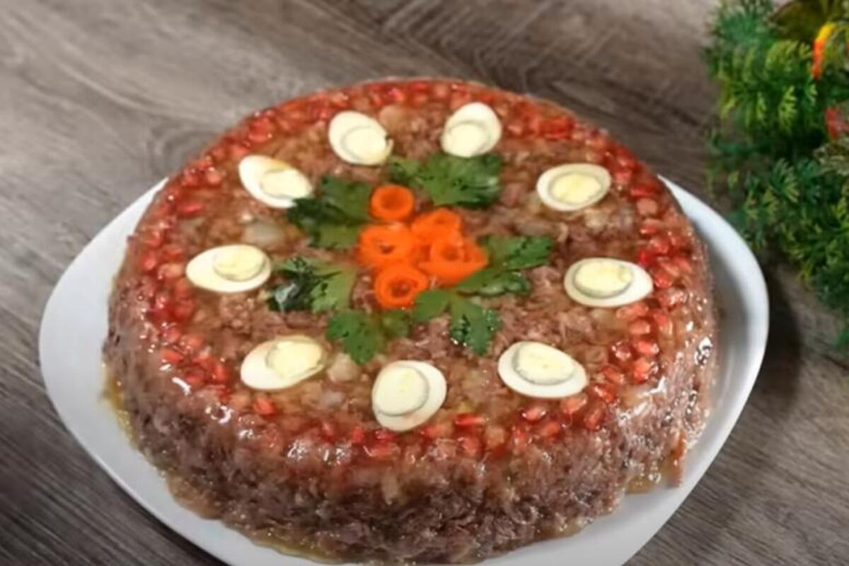 U vatrostalnu posudu sipajte još 150 ml bujona, pa na sredinu poređajte urolano šargarepu. Poređajte je uspravno i oko nje stavite listove peršuna. Zatim oko peršuna poređajte kuvana jaja isečena na pola, a po ivici pospite seme nara. Stavite u frižider/zamrzivač dok se potpuno ne stegne. Zatim sipajte još 250 ml supe, pa poređajte seckano meso. Opet sipajte bujon i stavite u frižider preko noći da se stegne.