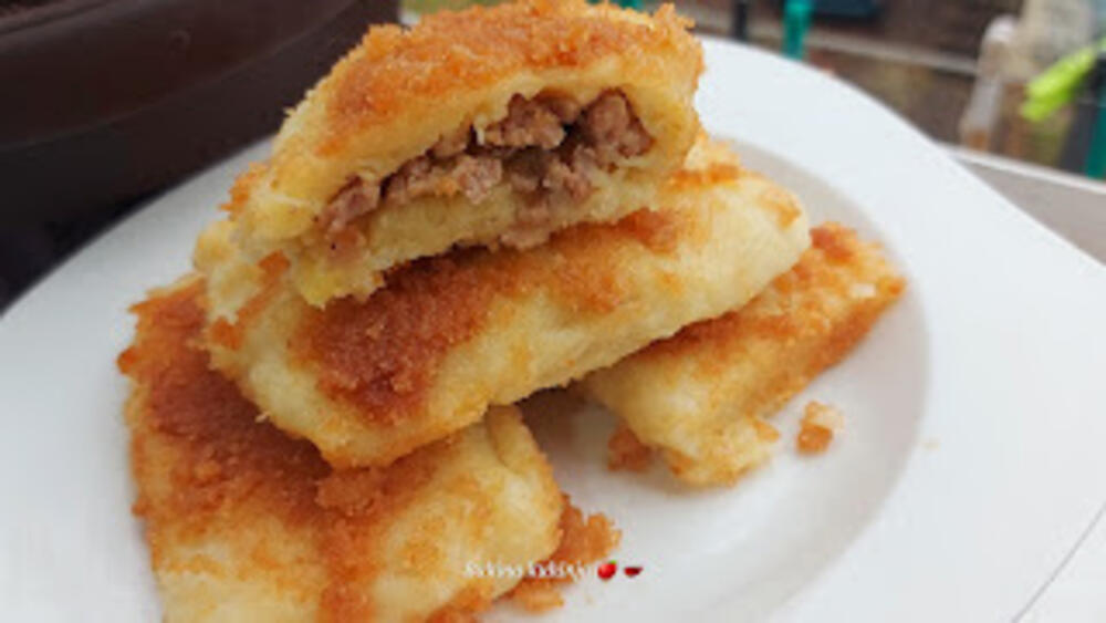 Krompir skuvati pa ga izgnječiti malo dodati ulja i soli pa mikserom izmiksati. Luk iseckati i propržiti i dodati ml meso pa pržiti 5-6 minuta.