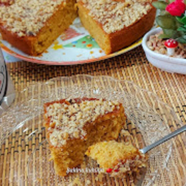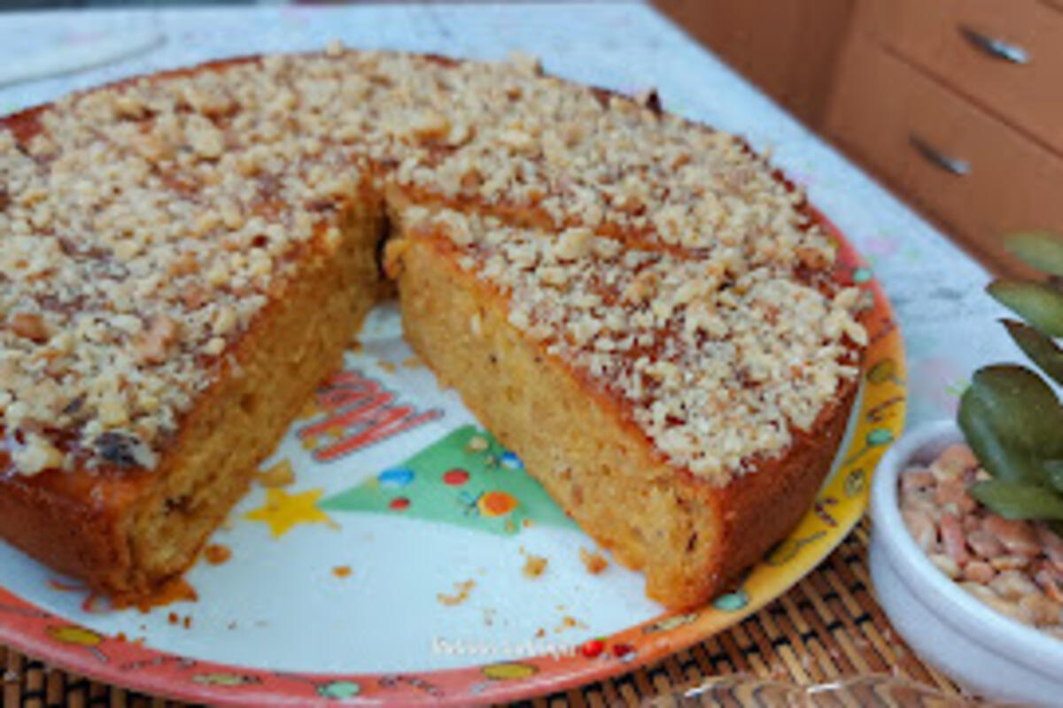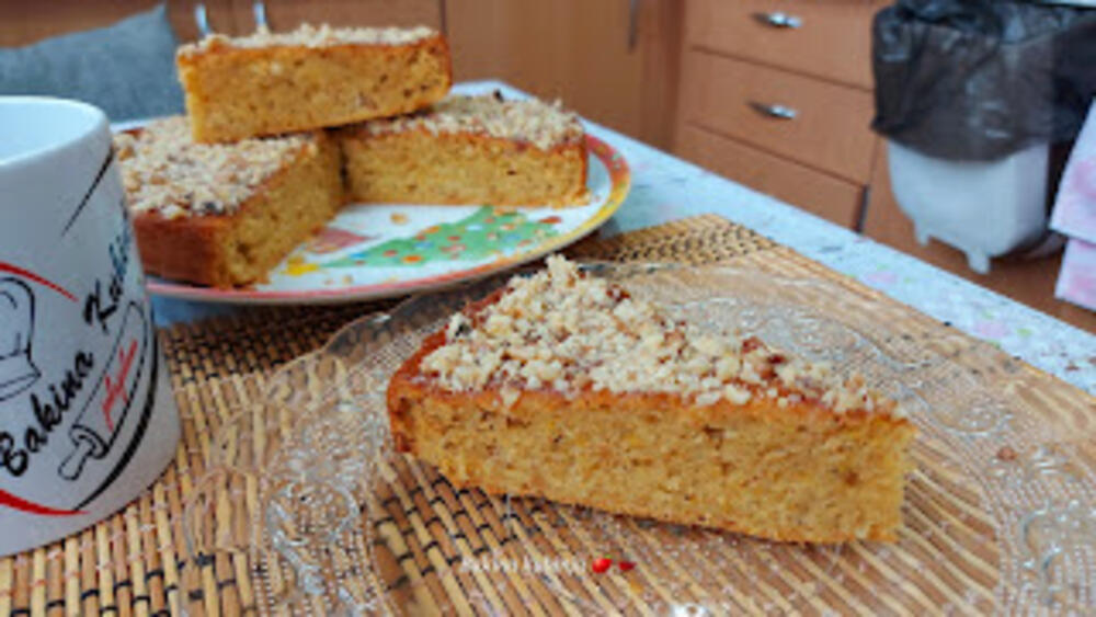 Sipati u podmazan pleh 22 cm i peći na 200 stepeni 30-40 minuta da kolač bide rumen i lagan. Odmah ga premazati džemom i posuti seckanim orasima, Seći prohlađen.
