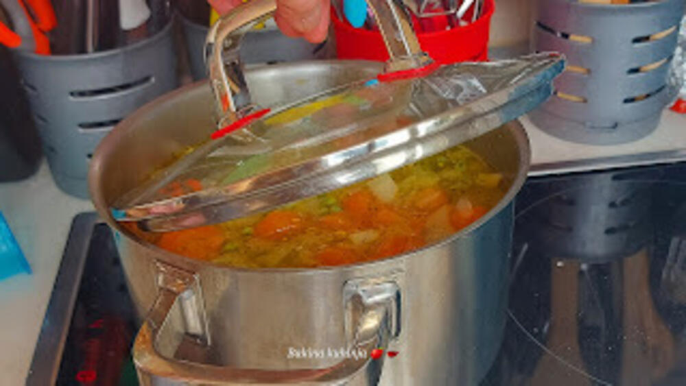 Naliti vodom i pustiti da se povrće skuva. Dodati suvi začin, ml biber po želju umućenu kašičicu brašna