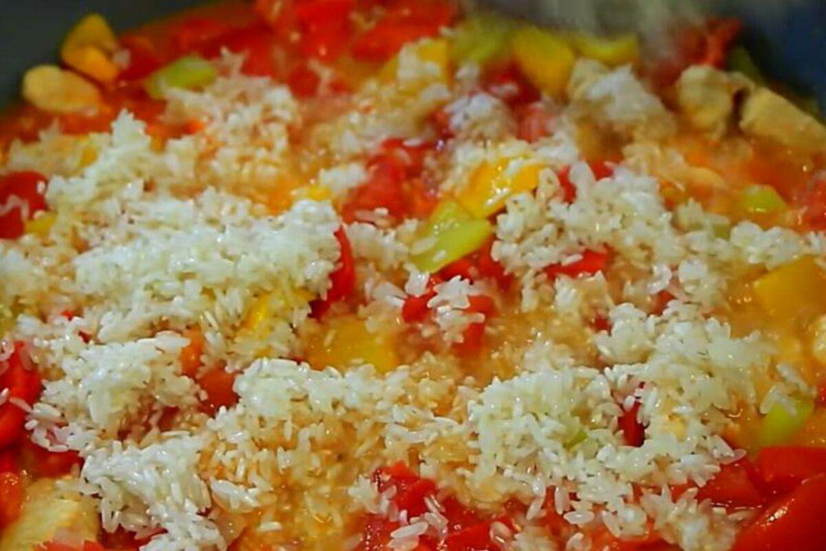 U drugu posudu skuvati pirinač. Kad je on gotov ocediti vodu i spojiti sa povrćem, pa staviti u vatrostalnu posudu i dodati pelat paradajz. Staviti u rernu da se zapeče na 220 stepeni oko 15 minuta.