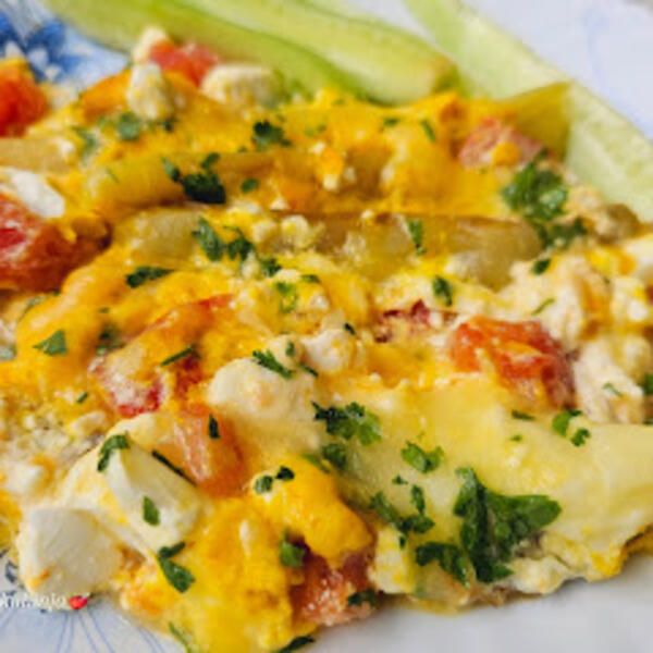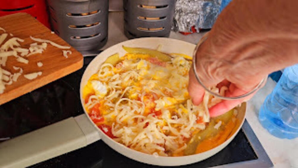 Posle 5-6 minuta dodati umućena jaja i na kraju rendan kačkavalj,