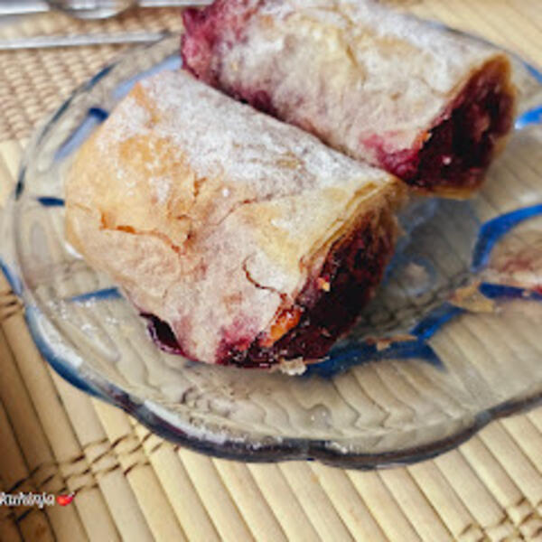 Na dno poredjati trećinu višanja saviti ivice i uviti. Tako i ostale dve. Oštrim nožem zaseći pitu da vam posle ne pusa.