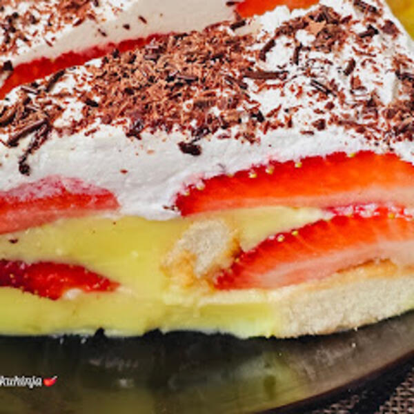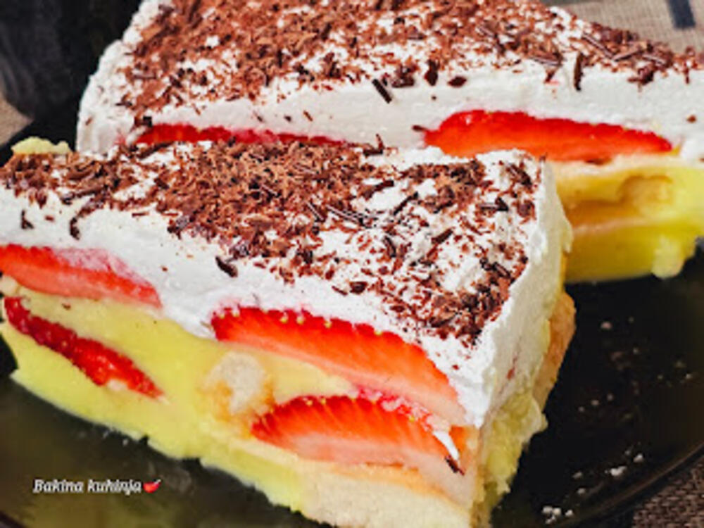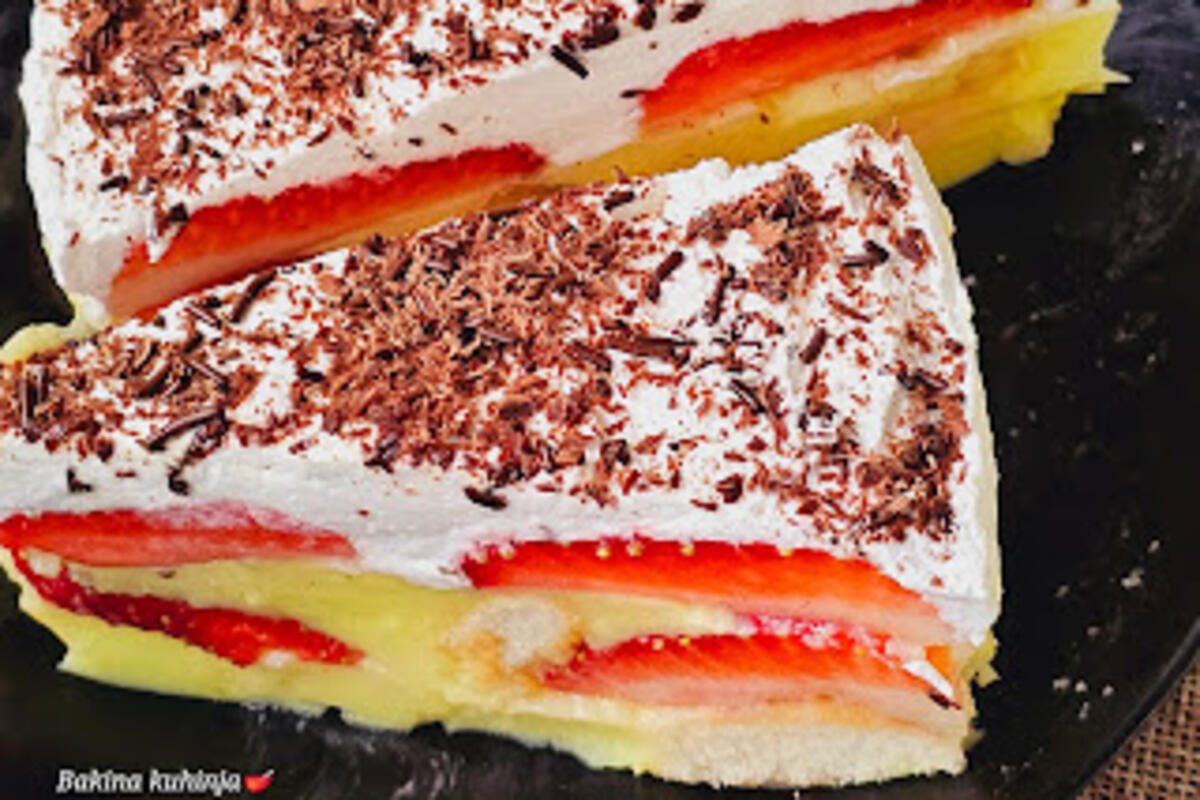 Odozgo sipati ostatak kreme i poredjati ostatak jagoda i staviti na hladjenje. Kad se malo ohladi umutiti pavlaku i sipati preko jagoda. Ostaviti preko noći da dobro se stegne