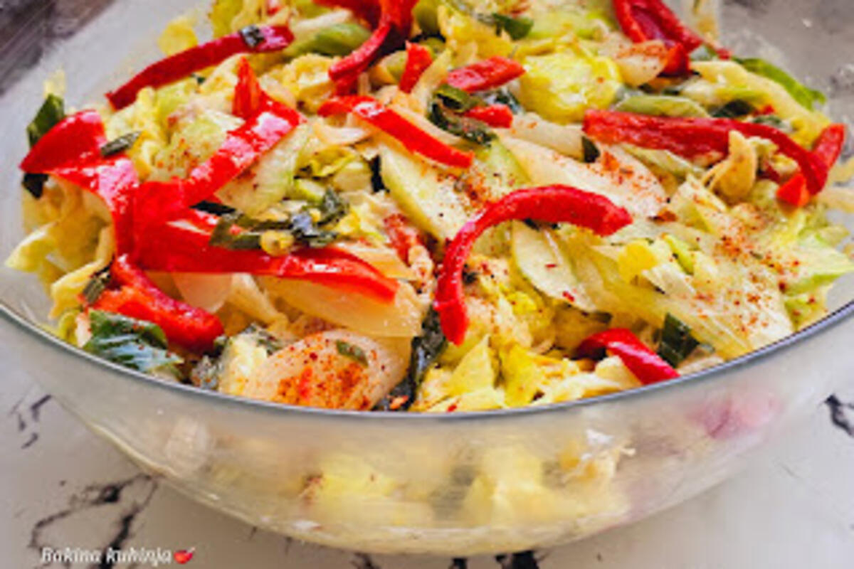 Salatu iseći tanko kao da sećete kupus na rezance pa posoliti i izmešati. Ostaviti po strani. Papriku iseći na rezance kao i mlad luk.